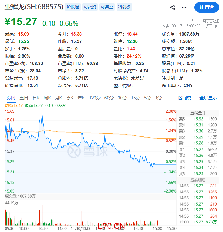 截至3月17日收盘,亚辉龙股价报15.27元/股,总市值为87亿元。