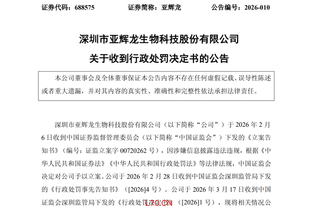 因信息披露违法违规,亚辉龙相关处罚落地。