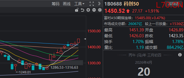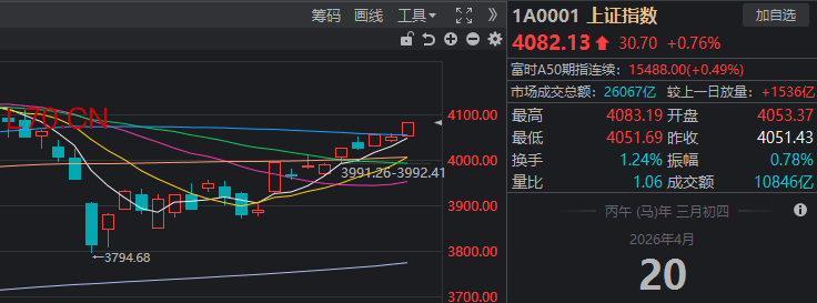 4月20日,三大指数涨跌不一,沪指震荡拉升,创业板指冲高回落,科创50指数涨超1.5%。截至收盘,沪指涨0.76%,深成指涨0.55%,创业板指跌0.02%。