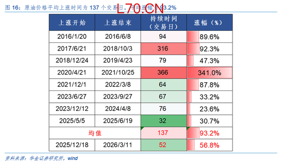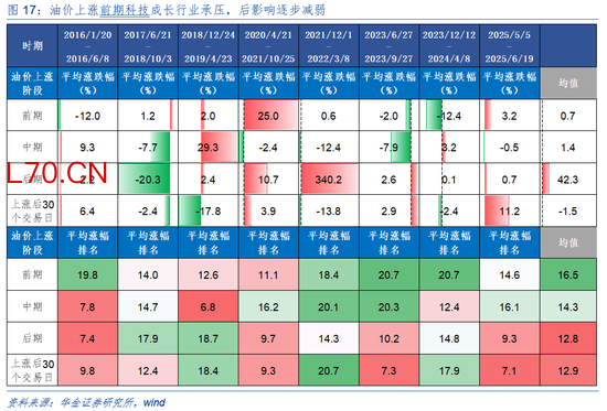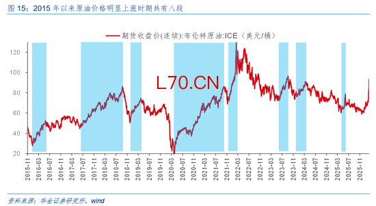 短期绩优科技和周期可能仍相对占优。(1)复盘历史,油价上涨对科技股的影响随时间推移可能逐步减弱。一是2015年以来原油价格明显上涨时期共有8段,平均上涨时间为137个交易日,平均涨幅为93.2%。二是油价上涨前期、中期、后期科技成长行业涨幅均值为0.7%、1.4%、42.3%,在全行业中涨幅排名均值为16.5、14.3、12.8,显示油价上涨对科技成长行业的压制逐渐减弱。(2)当前来看,油价上涨对科技成长行业的压制可能边际降低。一是自2025/12/18以来,布伦特原油价格上涨已持续52个交易日,涨幅达56.8%,涨幅已接近历史均值水平。二是美伊冲突对油价的影响可能边际有所降低,因各方释放储备、部分油运替代方案出现。三是当前处于业绩期,AI产业趋势上行导致科技硬件的业绩可能偏强,同时美伊冲突导致有色金属、石化、新能源、电力等景气上行,部分科技和周期行业短期可能相对占优。