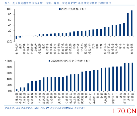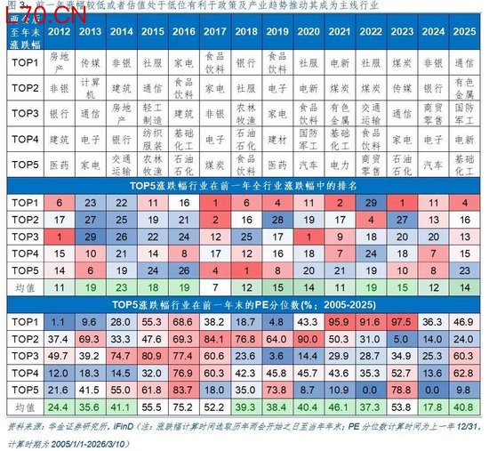 (4)前一年涨幅较低或者估值处于低位有利于政策及产业趋势推动其成为主线行业。具体来看,如:2013年移动互联网趋势下的TMT为涨幅TOP4行业,而TMT四行业在2012年全行业涨幅排名均值仅为19名,2012年末的PE历史分位数(2005年起,下同)约35.57%;2014年的非银、地产、银行等大金融板块表现较强,其在2013年的全行业涨幅排名中分别为第22、26、21名,PE分位数均值仅为41.11%;2015年的消费者服务、轻工制造、纺织服装等表现较强,前一年行业涨幅排名均值仅为18名左右;2016年以家电、食饮为首的周期板块表现较强,TOP5行业在2015年全年的涨幅排名均值为19名左右;2019年的电子(前一年全行业排名位置为28,年末PE分位数为64.01%,下同);2020年的电新(19、89.96%);2021年的煤炭(17、50.31%);2023年的传媒、通信、家电等(均值:15、53.77%);2024年的商贸零售(20、25.27%);2025年的基础化工(23、9.81%)等。