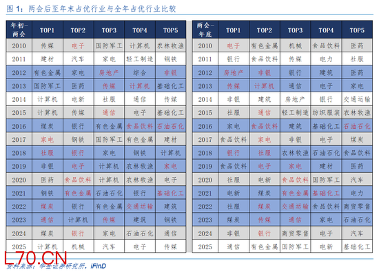 1、两会后主线行业可能为开年到两会期间占优的行业