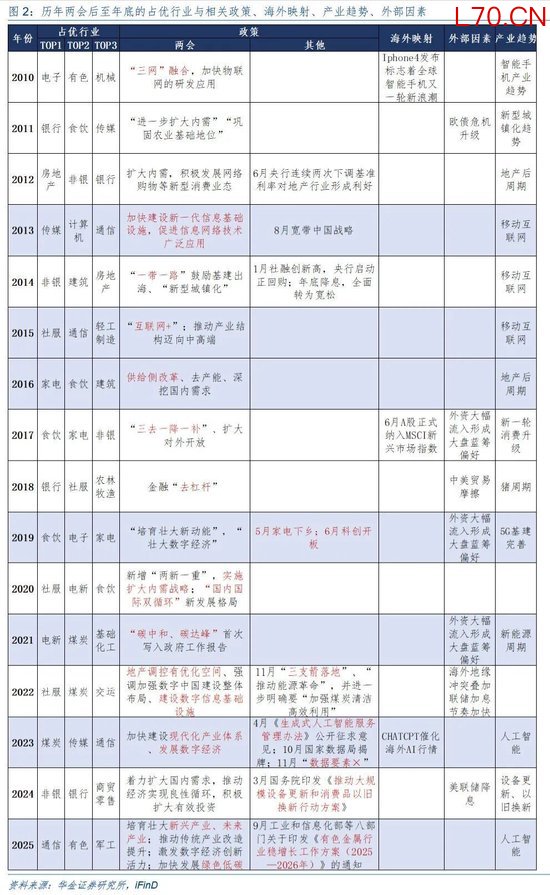 (2)两会定调对主线行业的形成有较强的推动力。具体来看,如2010年的两会强调发展“三网融合”下大力发展3G、2013年的“加快建设新一代信息基础设施”下发展移动互联网、2015年的将“移动互联网+”写入政府工作报告、2016年受前年11月中央财经领导小组会议、当年“十三五”规划纲要、政府工作报告的指引下全面展开 “供给侧结构性改革”、2019年受中美贸易摩擦影响下《政府工作报告》强调“培育壮大新动能”、并在后续6月开启科创板、2020年疫情背景下的“扩大内需战略”、2021年的首次将“碳中和,碳达峰”写入政府工作报告、2023年两会强调“发展现代化产业、大力发展数字经济”,后续辅以《生成式人工智能服务管理办法》公开征求意见、国家数据局成立等政策跟进、2024年两会强调着力扩大内需,出台《推动大规模设备更新和消费品以旧换新行动方案》、2025年两会强调发展新兴产业和未来产业,并加快发展绿色低碳经济,均为后续促进全年主线形成的重要影响因素。