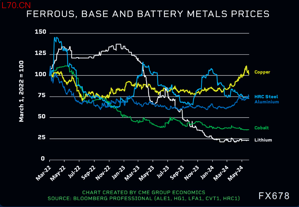 首先,在各种工业金属中,铜是唯一一种处于历史高位的金属。铝和钢的价格比两年前低了20%,而锂和钴的价格则比创纪录水平低了三分之二到四分之三。