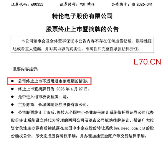 *ST精伦本次退市遵循“市值退”原则,3月9日至4月3日,*ST精伦连续20个交易日的每日股票收盘总市值均低于5亿元,触发《股票上市规则》相关条款。*ST精伦股票终止上市后,将转入全国中小企业股份转让系统依托原证券公司代办股份转让系统设立并代为管理的两网公司及退市公司板块挂牌转让。