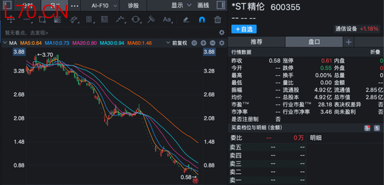自1月27日起,*ST精伦股价急速下跌。在此前一日,公司总市值还超过11亿元,不过在43个交易日之后,*ST精伦股价累计下跌近75%。公司股票停牌前的最后一个交易日,*ST精伦股价报0.58元/股,总市值2.85亿元。