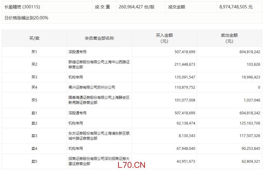长盈精密今日20cm涨停,1家机构专用席位净买入1.15亿元
