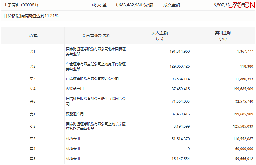 山子高科今日涨停,有3家机构专用席位净卖出1.62亿元